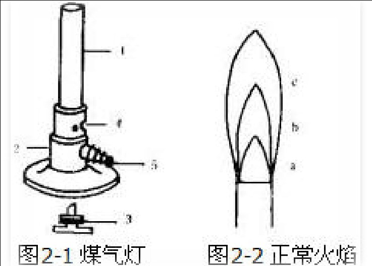 ⑴ 煤氣燈的使用:煤氣燈的式樣眾多,但構造原理基本相同,如圖 2-1 所示。它由燈座 2 和金屬燈管 1 兩部分組成,金屬管下部有螺旋可與燈座相連,其下有幾個圓孔為空氣入口 4。螺旋金屬管既可完全關閉也可不同程度地開啟圓孔,以調節空氣的進入量。燈座側面有煤氣的入口 5,可用橡皮管把它和煤氣的氣門相連,將煤氣導入燈內。燈座下面有一螺旋針 3(有的煤氣燈是在側面),用以調節煤氣的進入量。將它向下旋轉時,燈座內進入煤氣的孔道放大煤氣的進入量即增加。