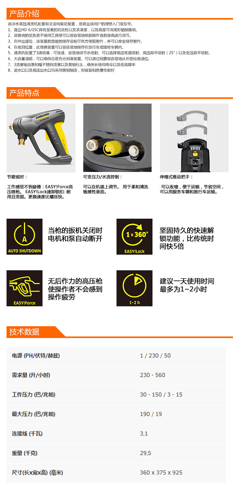 冷水高壓清洗機,用于日常商業應用。具有緊湊式結構,結實的構造以及更大的可操縱性,該裝置屬于緊湊型。