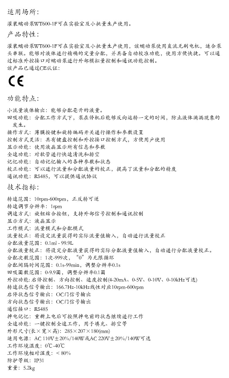 灌裝蠕動泵WT600-1F可在實驗室及小批量生產使用,該蠕動泵使用直流無刷電機,適合泵頭串聯。