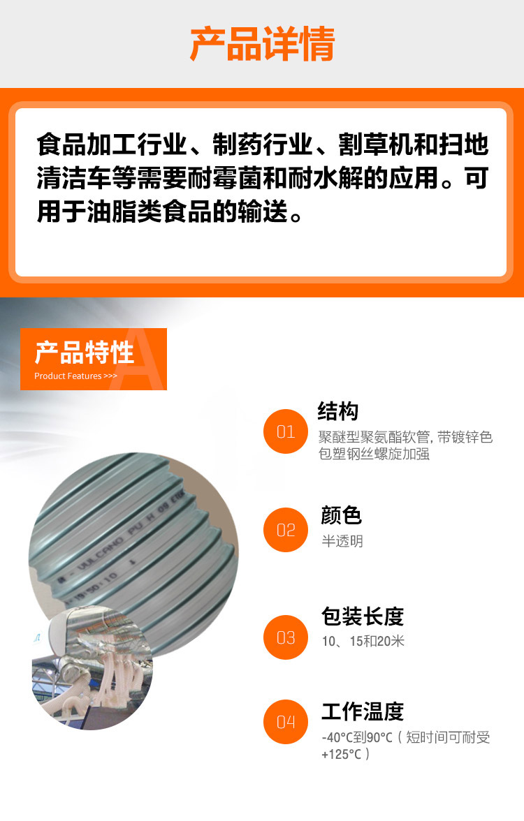 IPL食品級(jí)鋼絲PU管VK用于食品加工行業(yè)、制藥行業(yè)、割草機(jī)和掃地清潔車等需要耐霉菌和耐水解的應(yīng)用。可用于油脂類食品的輸送。