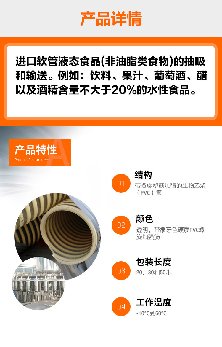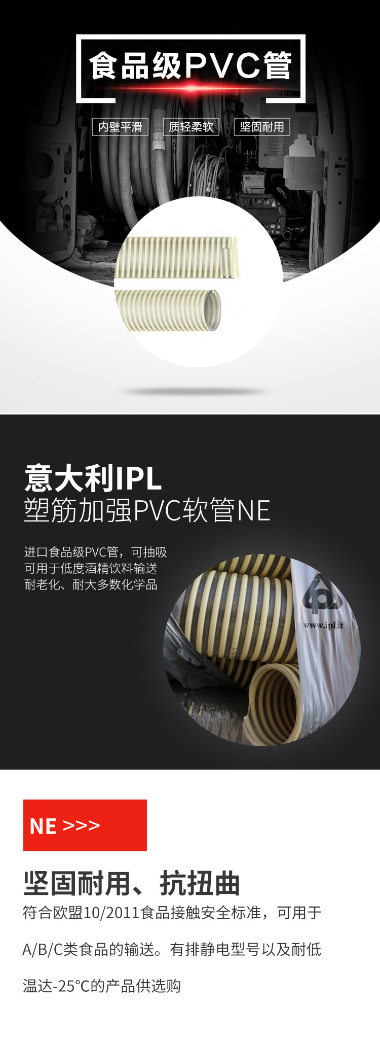 IPL塑筋加強PVC軟管NE用于食品、飲料的的抽吸和輸送。特別適合谷物、砂糖、飼料、面粉等磨損性食品物料的輸送。可用于酒精度不大于20%的水性食品輸送,可用于油脂性食品的輸送。