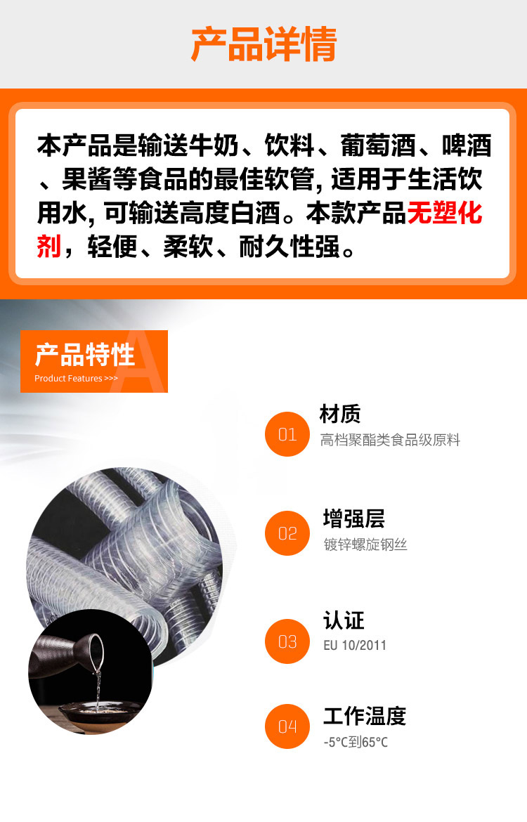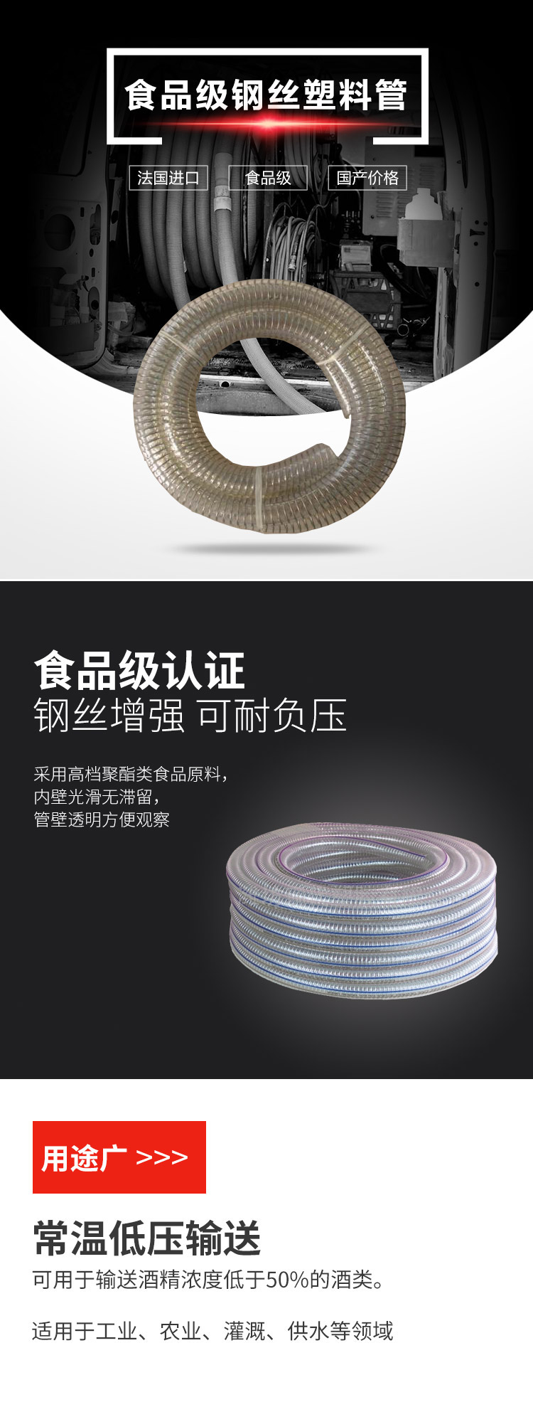 GAP食品級透明鋼絲塑料管FLEXACIER LT SPH,設計用于低壓高品質液態食品排放,可用于輸送酒精濃度低于50%的酒類。適用于工業、農業、灌溉、供水等領域。