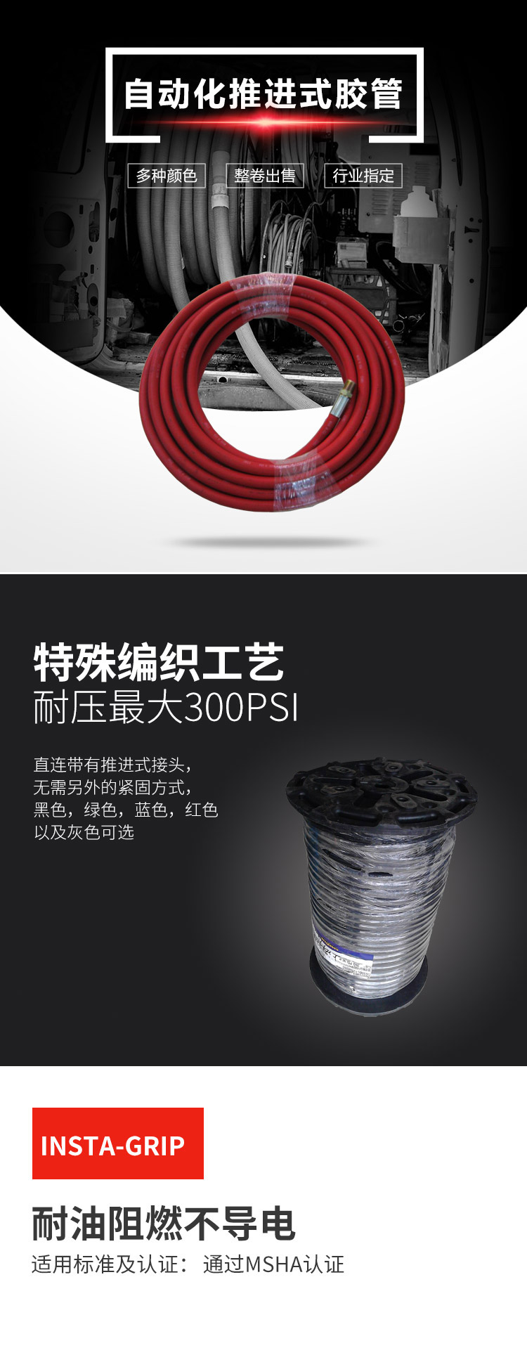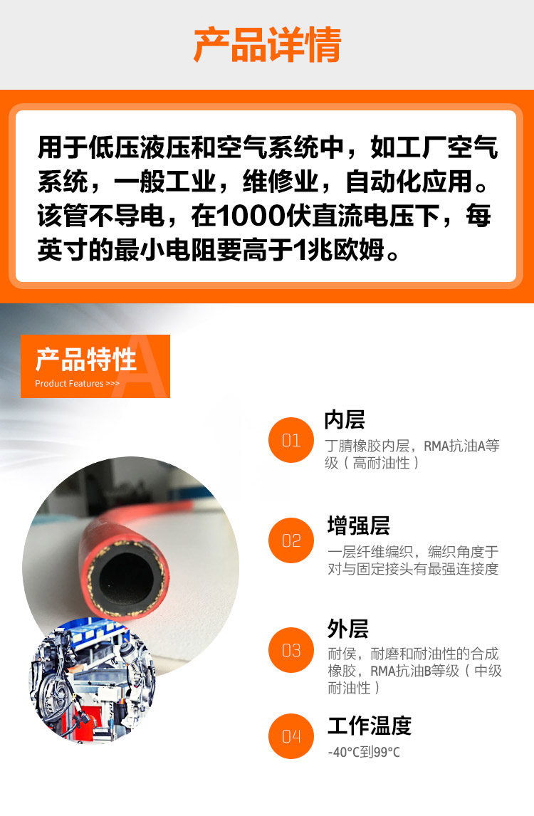 康迪泰克(原美國固特異)推進式軟管INSTA-GRIP300,用于帶有推進式接頭壓力位300psi場所,是用于低壓液壓和空氣系統中,如工廠空氣系統,一般工業,維修業,自動化應用。該管不導電,在1000伏直流電壓下,每英寸的小電阻要高于1兆歐姆。